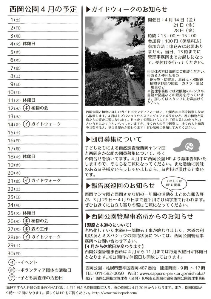 裏面では4月に開催されるガイドウォークや管理事務所からのお知らせなどをお伝えしています。