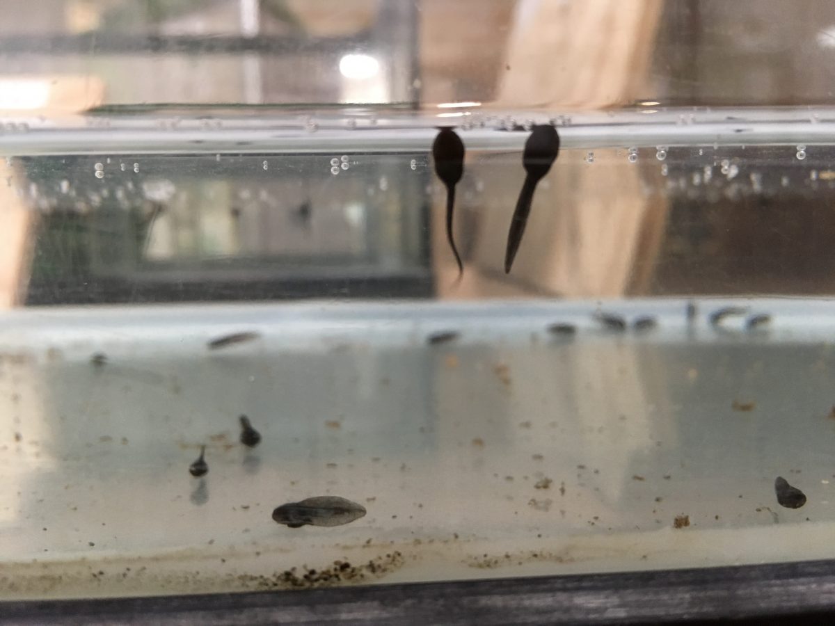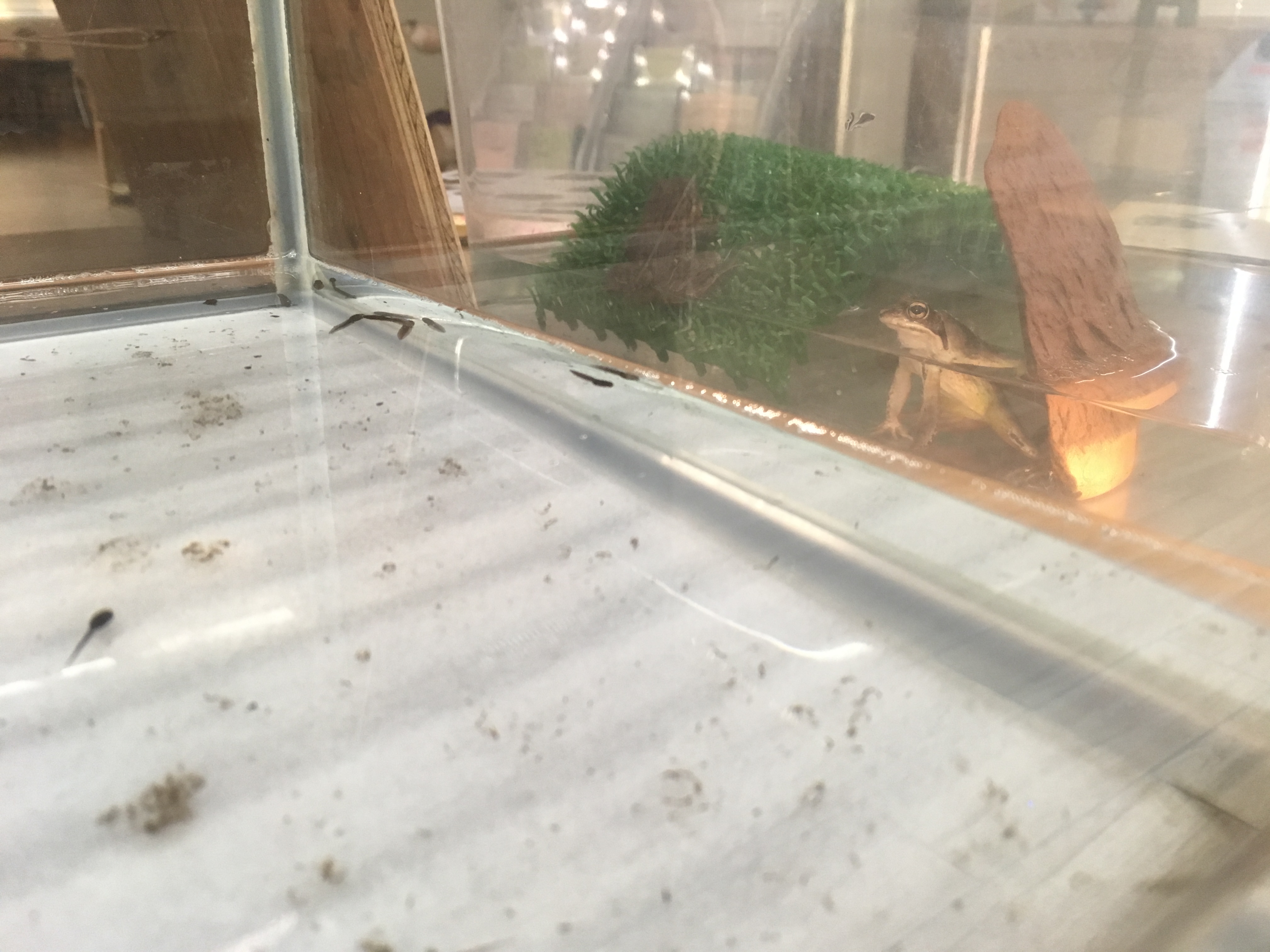 無事に孵化したオタマジャクシを展示室で展示しています。