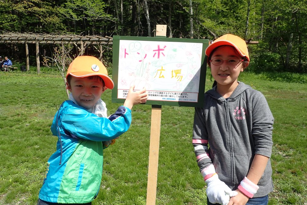 看板が出来上がるといよいよ園内に出て、看板の取り付けです。看板取り付け中はちょっとした園内の散策にもなり、団員たちはエゾハルゼミの抜け殻を見つけて、大盛り上がりでした。
