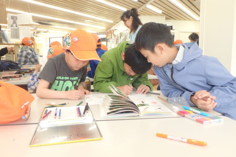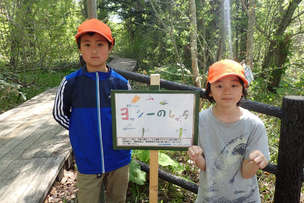 団員たちは図鑑でトンボを調べたり、園内のことをスタッフに聞いたりしながら看板作りを進めます。この時心強いのがヤンマ団を卒団した中高生スタッフです!新団員のサポートに付いてくれたり、アドバイスをしてくれました。