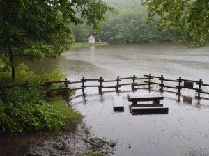 今朝の水源池は、昨日よりも50cmほど水位が上がり、展望テラスまで