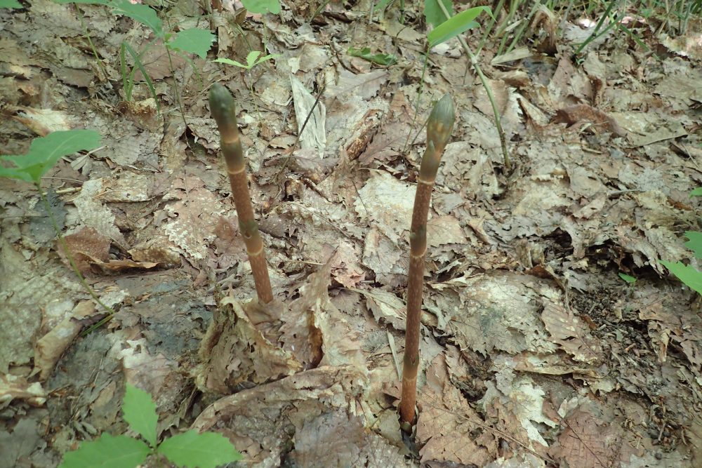 「オニノヤガラ」も確認出来ました。今はアスパラガスのような姿ですが、ラン科の植物でこれから花も咲きます。