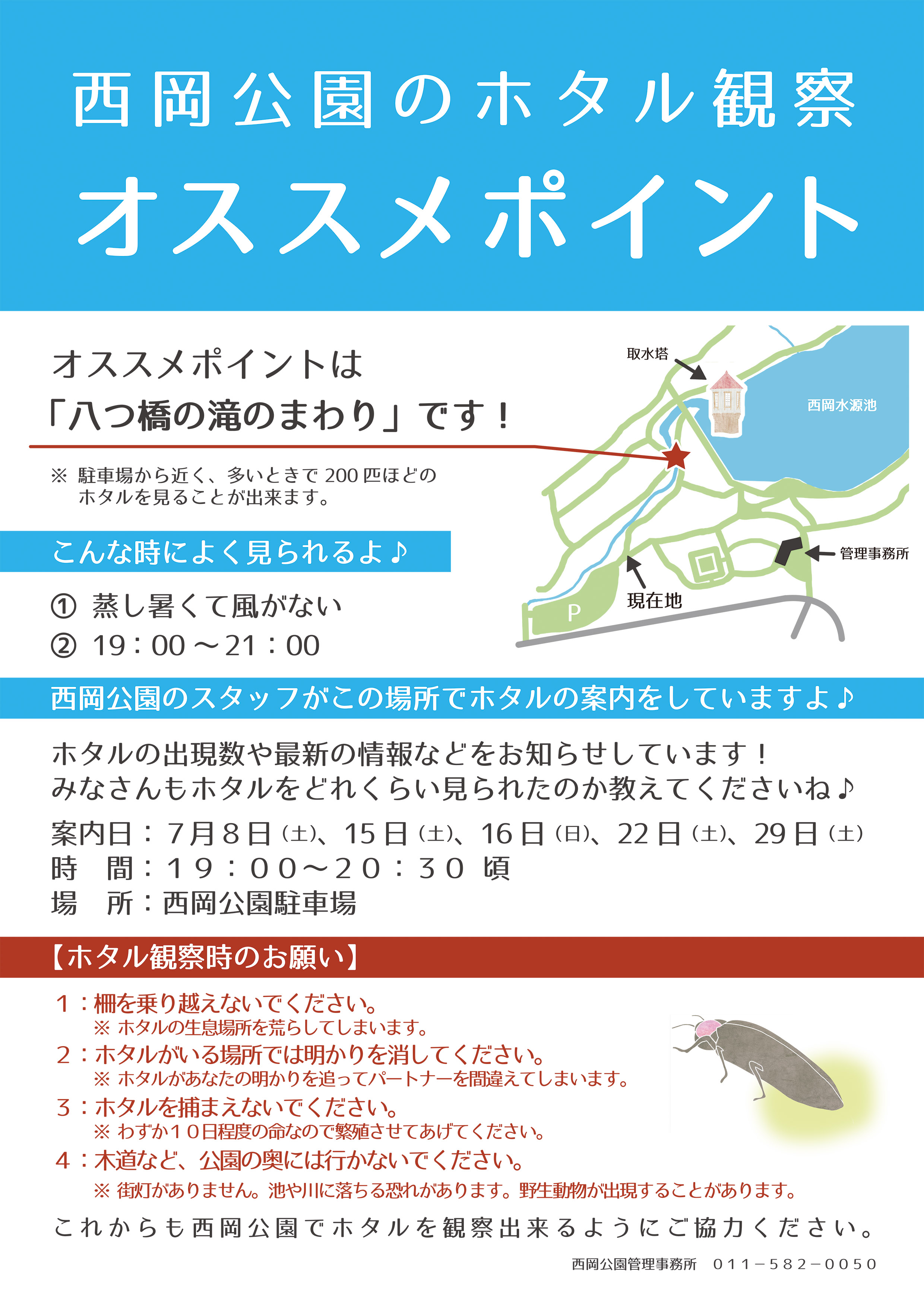 西岡公園では、暑い季節ならではのヘイケボタルが観察出来ますよ♪