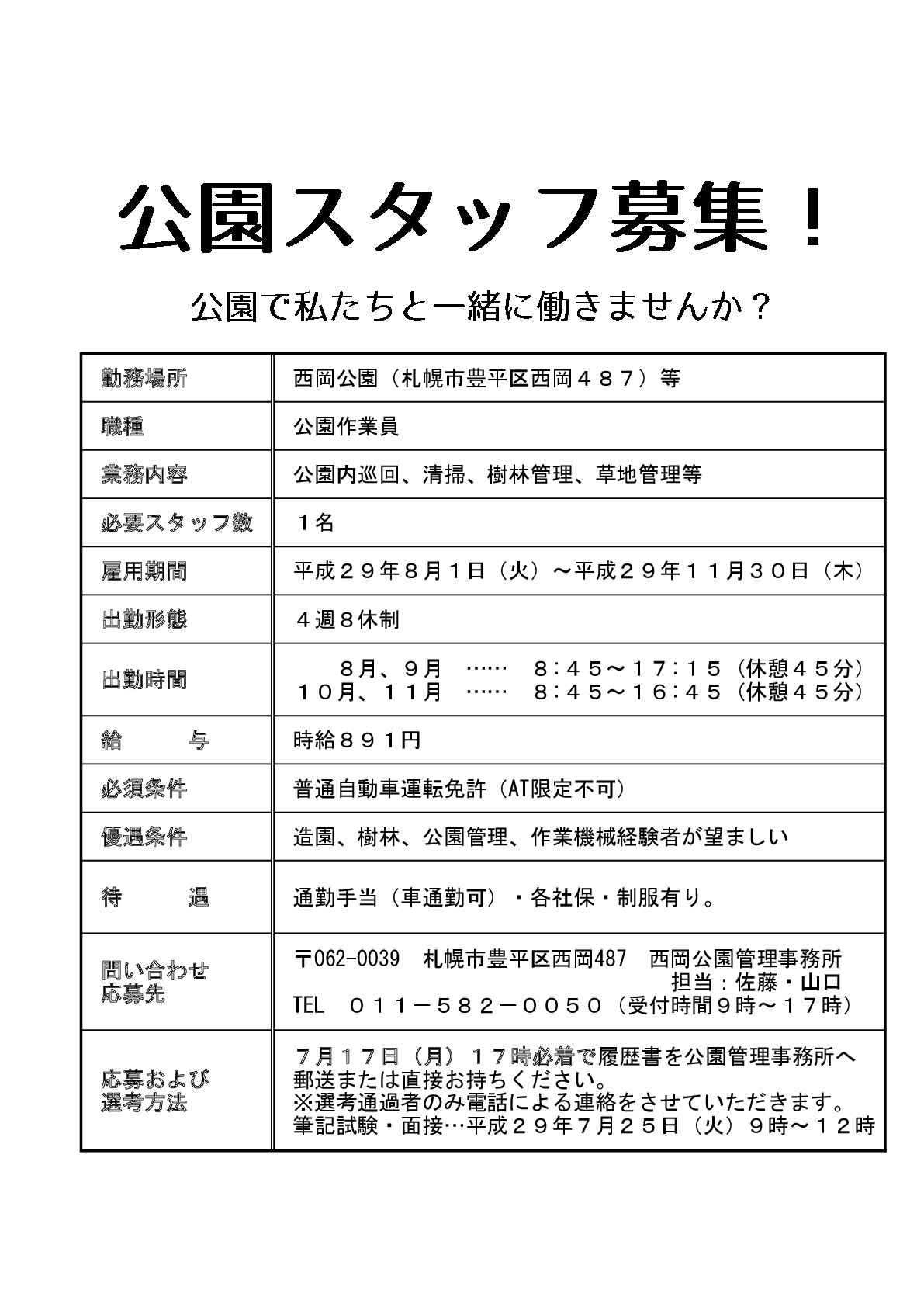 | 問い合わせ・応募先 | 〒062-0039 札幌市豊平区西岡487 西岡公園管理事務所 担当:佐藤・山口 TEL 011-582-0050(受付時間9時~17時) |