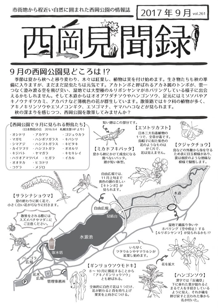 裏面では、9月のイベントとしてガイドウォークや子りす工房の開催、西岡公園のおまつり「にしおかピクニック」、管理事務所からのお知らせをお伝えしています。