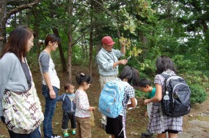 まずは、樹木医さんと一緒に公園を歩いて、スタンプする葉っぱを集めます。
