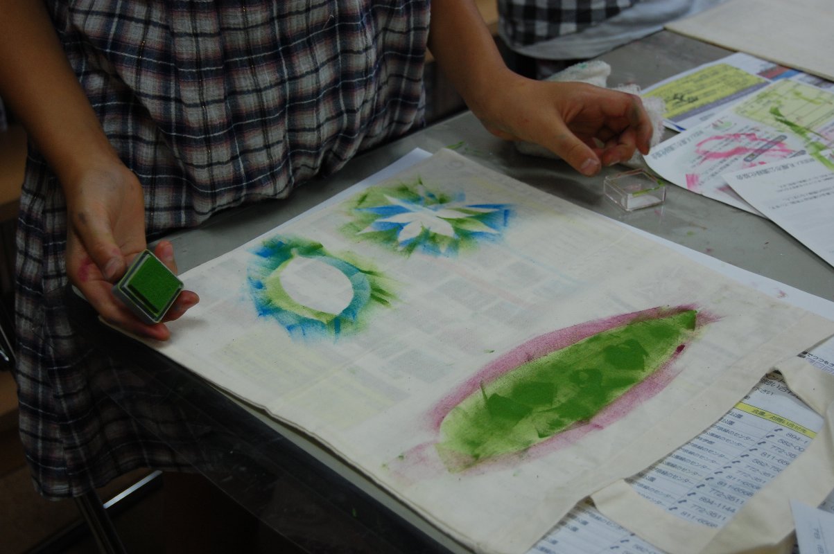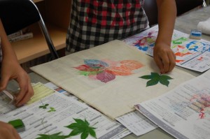 事務所に戻ったら、採ってきた葉っぱを使って、エコバックやはがきを作りました。