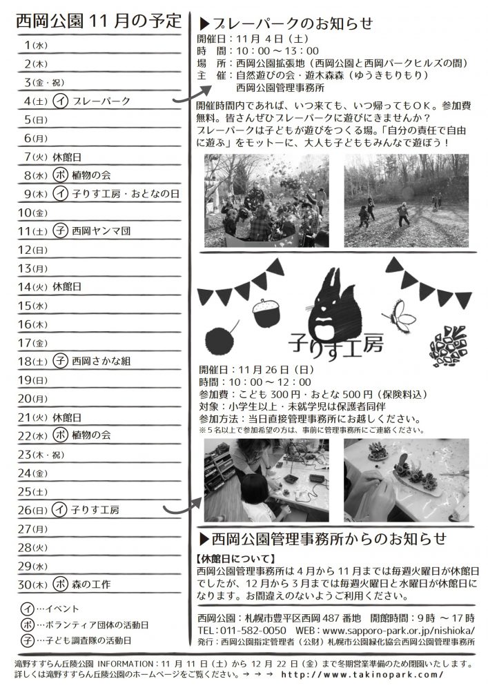 裏面では、11月のイベントとしてプレーパークや子りす工房の開催、管理事務所からのお知らせをお伝えしています。