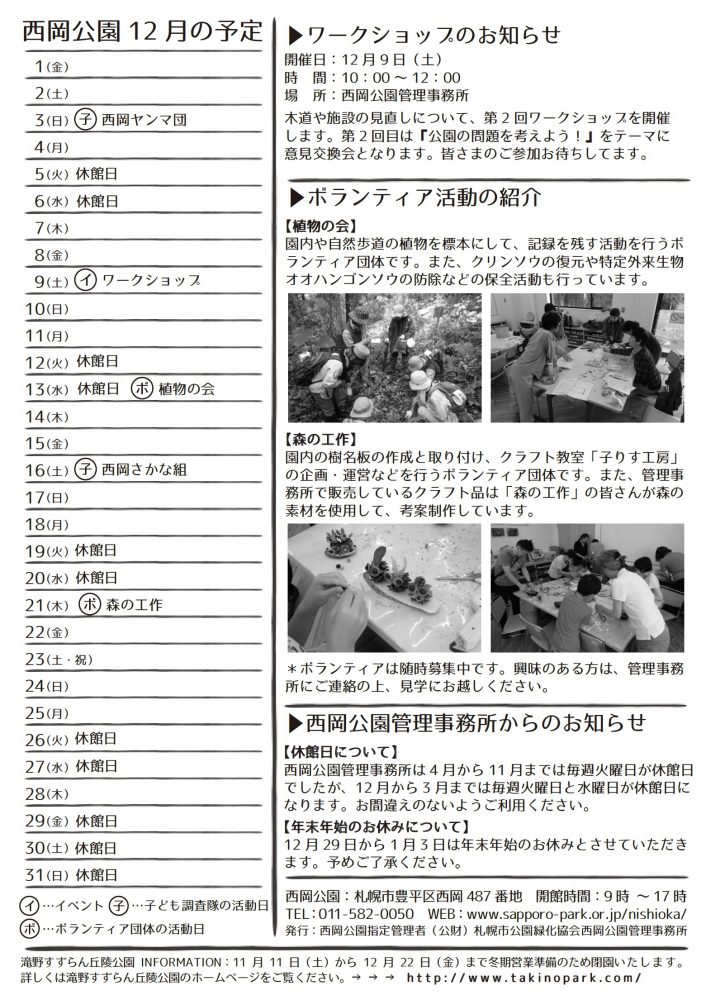 裏面では、西岡公園でボランティア活動を行っている団体の活動紹介や、管理事務所からのお知らせをお伝えしています。