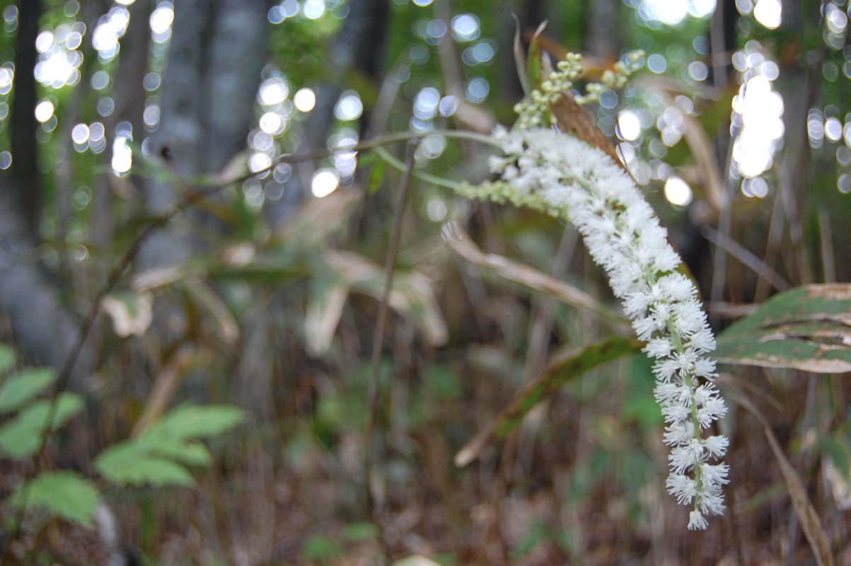 園内では、秋の花が咲き始めています。 写真の花は、「サラシナショウマ」。1mほどの背丈で、穂状の 白い花を咲かせます。 森の中で、この白い花は、一際目を引くので、ご存じの方も多いのでは ないでしょうか。 この花は虫にも大人気のようで、よくチョウなどの虫が集まってきて いますよ。