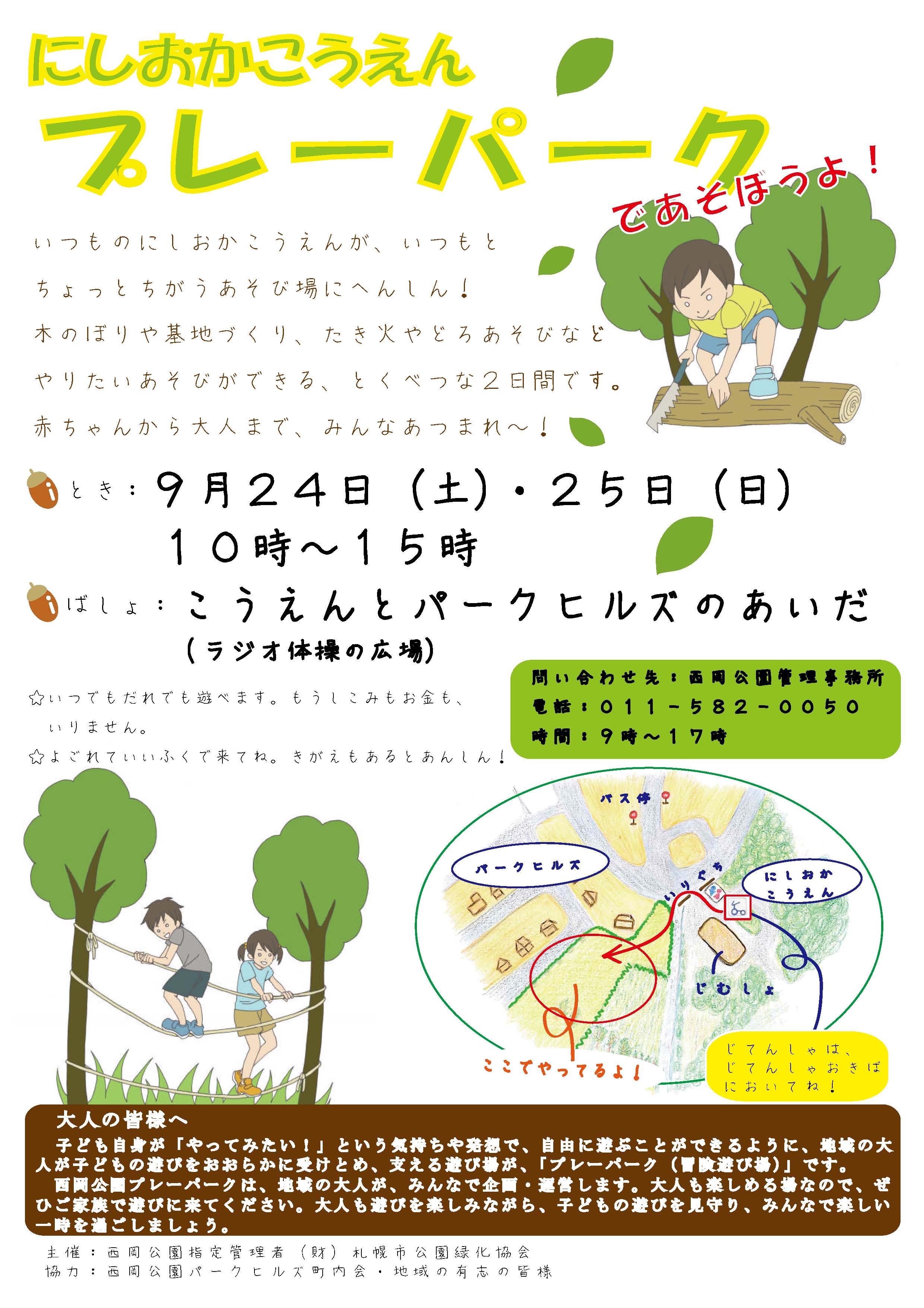 先日もお知らせしましたが、9月24日・25日の2日間、 西岡公園とパークヒルズ町内会のあいだの土地で、 子ども達が自由に遊べる場「プレーパーク」を行います。