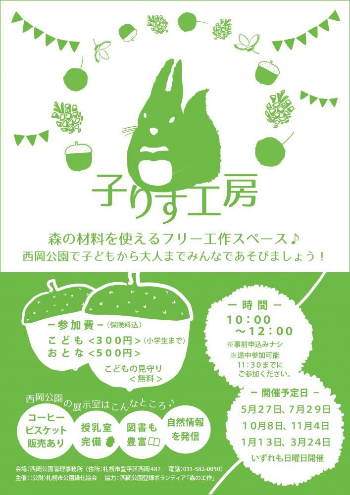 子りす工房は、西岡公園のボランティア団体「森の工作」のスタッフがサポートしてくれる木工クラフト教室です。