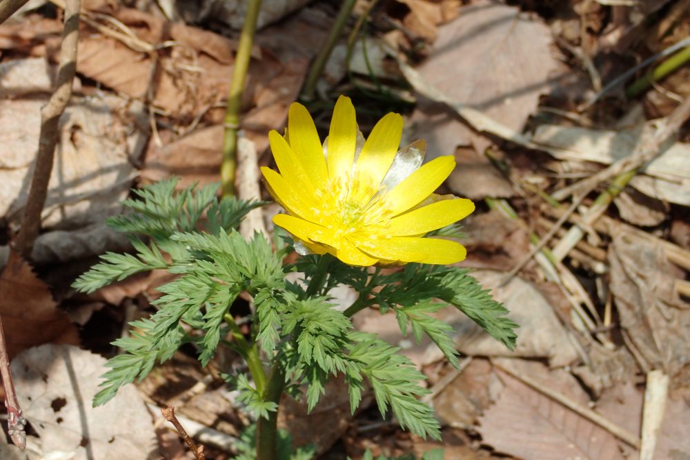 フクジュソウです。散策路脇でそっと咲いています。参加されたみなさんも下を見たり、上を見たり大忙しです。
