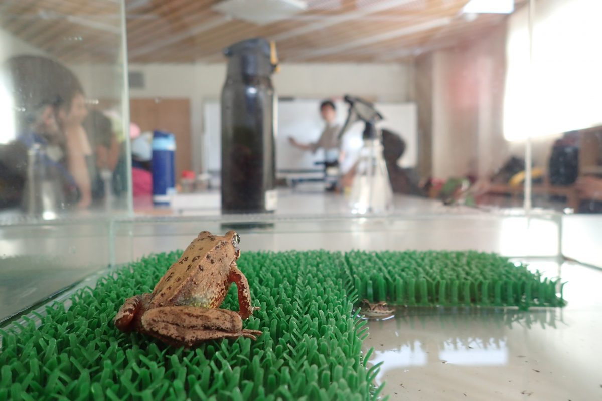 管理事務所に戻ってから、早速エサをあげてみたところ、今回ゲストで来てくれていたアズマヒキガエルが長い舌で虫をとらえる姿や、素早い動きでエサに飛びつくエゾアカガエルの姿を見ることが出来ましたよ。