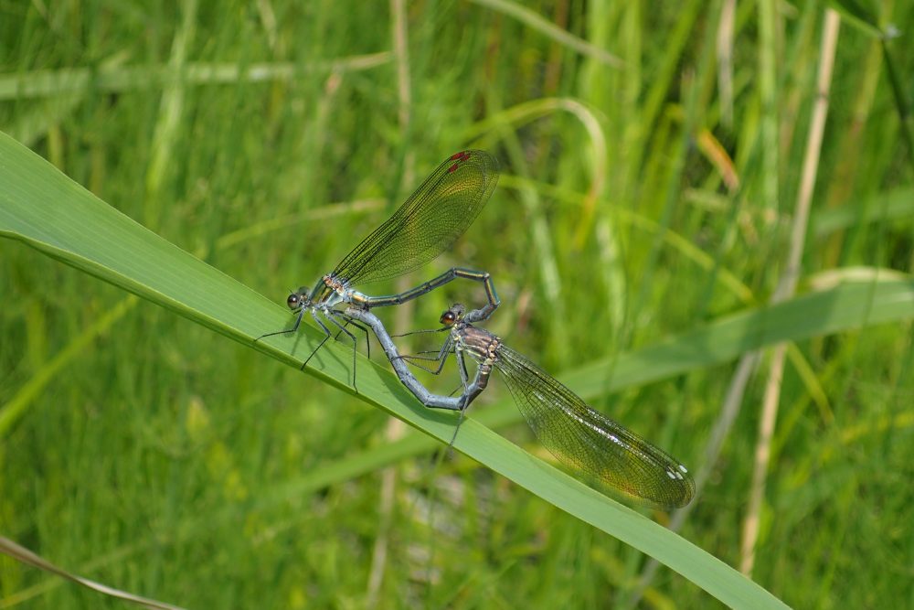 交尾中のニホンカワトンボです。前(向かって左)がオス、後ろ(向かって右)がメスです。