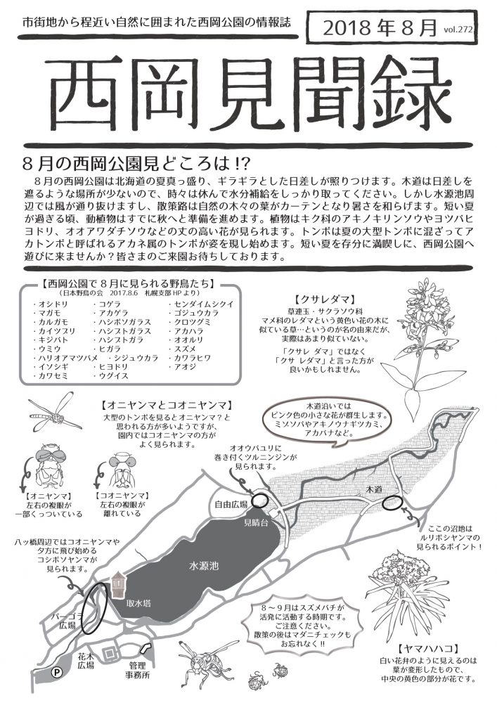 今月の表面には、散策の際に見られるキク科の植物や湿地の植物、そして夏の大型トンボの見どころとトンボの見分け方を紹介しています。