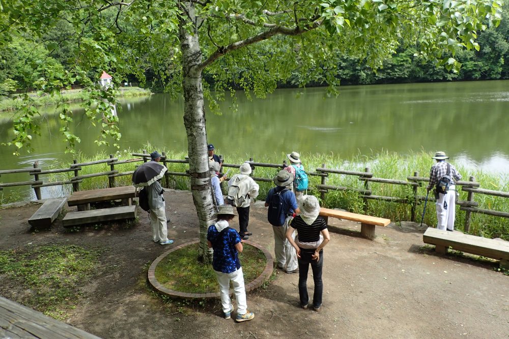 水源池ほとりで西岡公園の成り立ちや虫、植物の説明を受けて公園内をさっそく