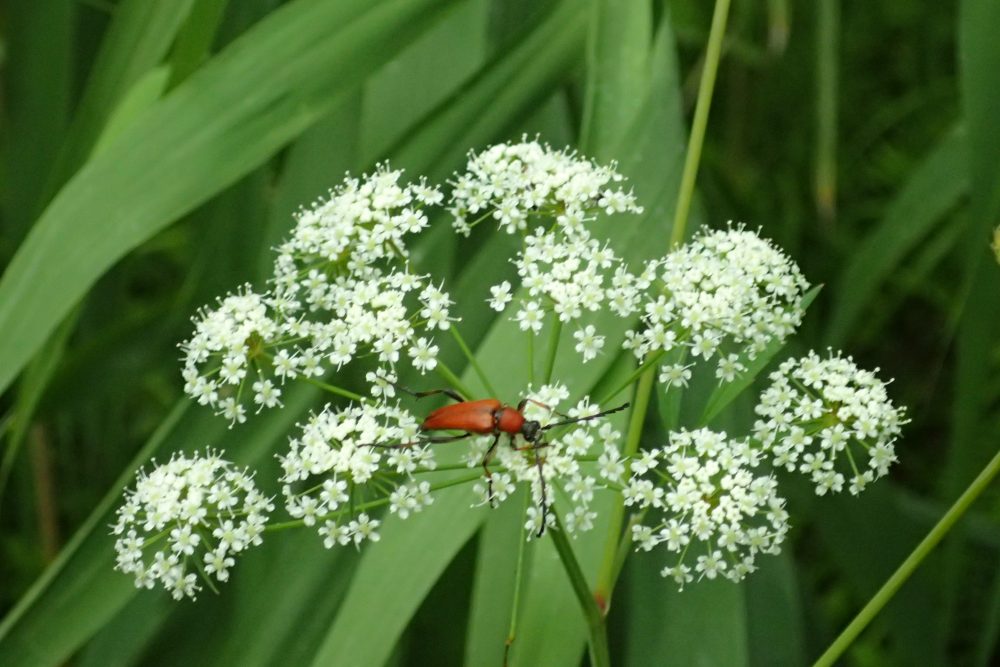 ドクゼリの花の上にアカハナカミキリが乗っています。2センチほどの大きさですが