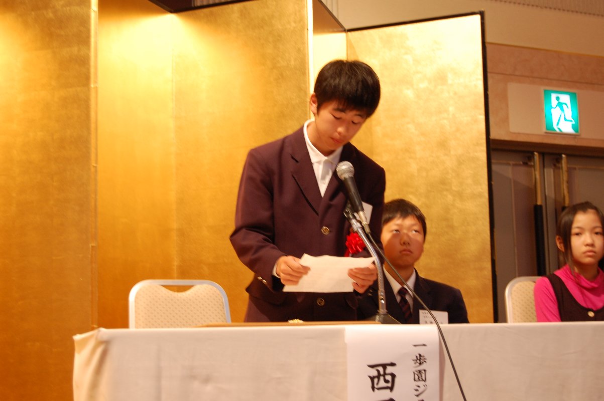 賞状と活動資金の授与の後に、中学生スタッフの田中哉光君が代表してスピーチをしました。