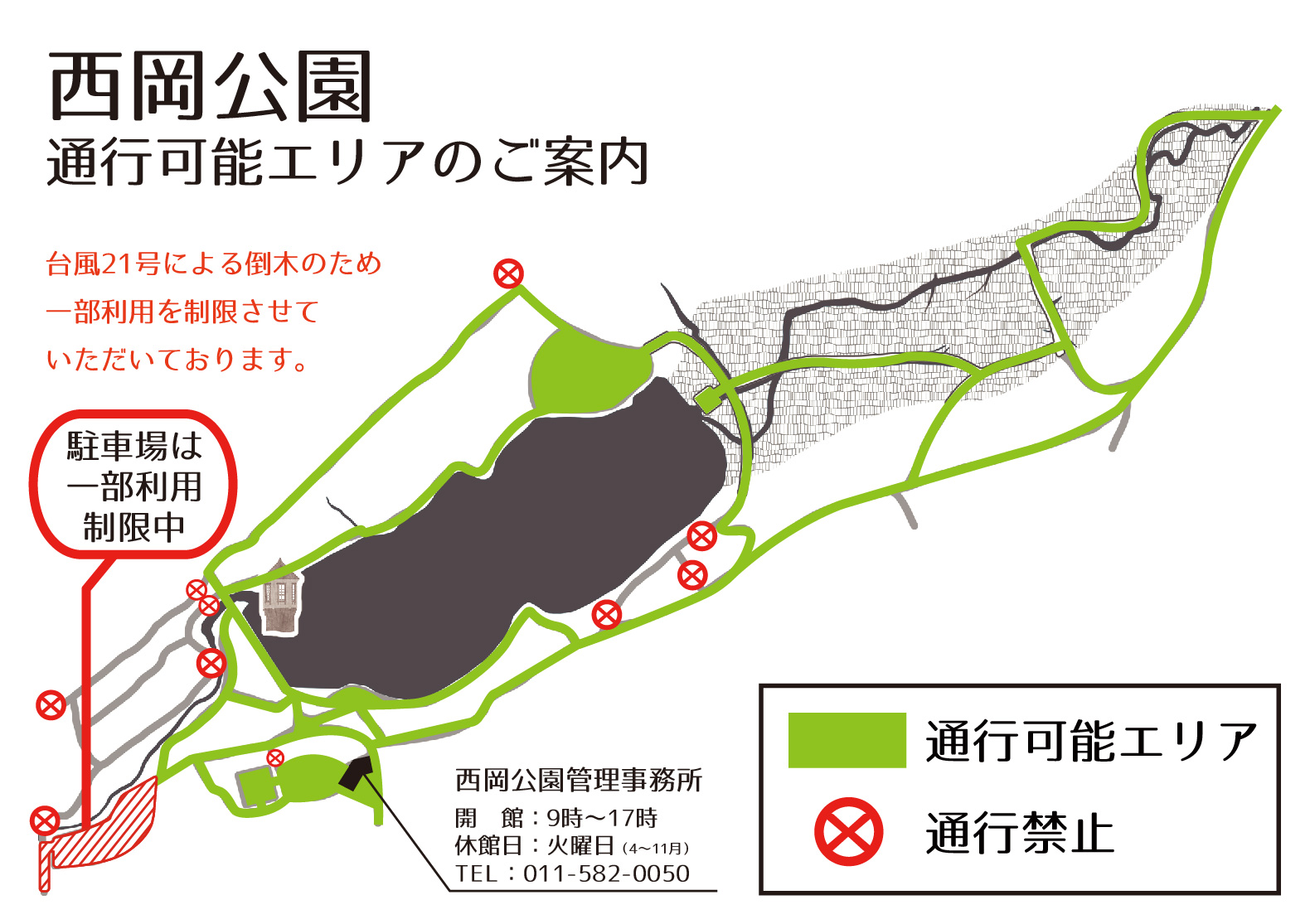 台風による倒木などの影響で西岡公園を一部通行禁止とさせていただいておりますが、21日より駐車場を一部開放いたします。