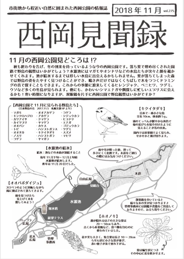 「西岡見聞録」2018年11月号ができました。 今月の表面にはいよいよ秋も終わりに近づき、厳しい冬を迎える園内の様子をお伝えしています。雪が降る前にあちこちで見かける木の実や種、手に取ってよく観察していただければと思います。 裏面では、11月のイベントとして子りす工房の開催、管理事務所からのお知らせをお伝えしています。 展示室にて無料配布しています、ぜひお手にとってご覧ください。