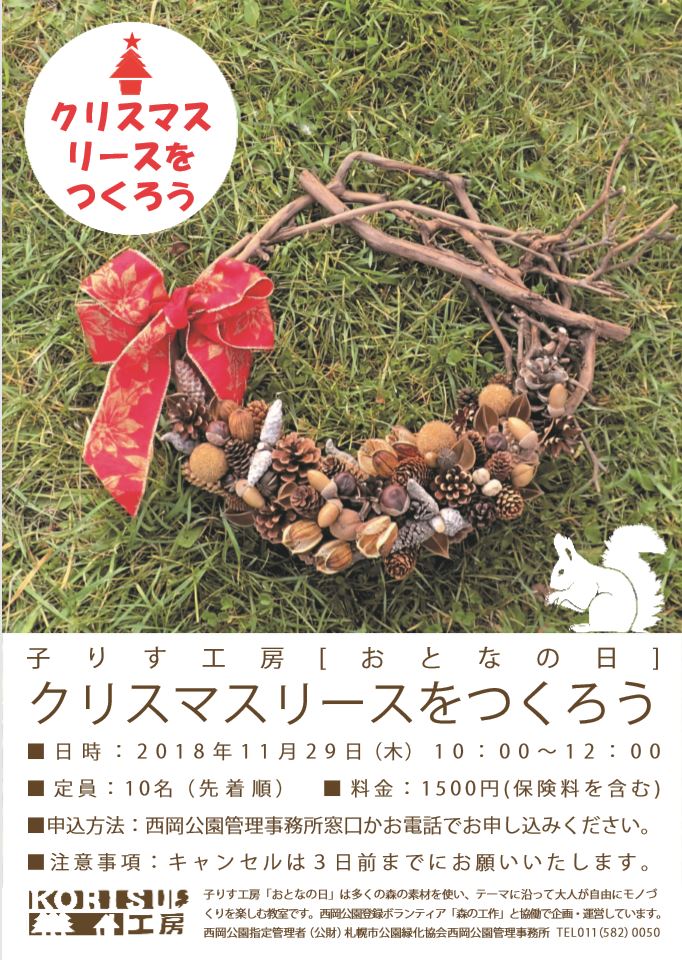 『クリスマスリースをつくろう』をテーマに、毎年西岡公園の豊富な木の実や松ぼっくりを使ってオリジナルのクリスマスリースを皆さんと一緒に作ります。