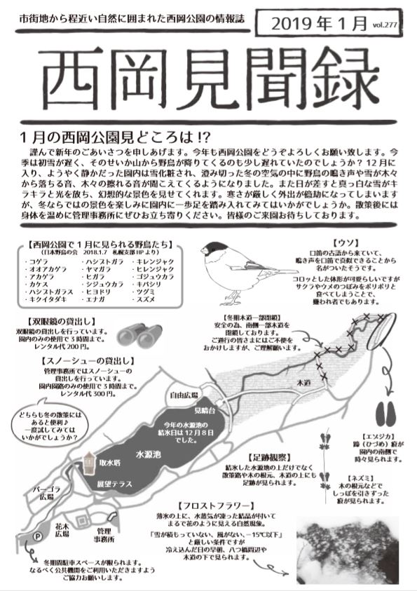 今月の表面には、雪上に残った動物たちの足跡の特徴や冬に見られる自然現象、冬を楽しむための貸出しグッツなどをお伝えしています。