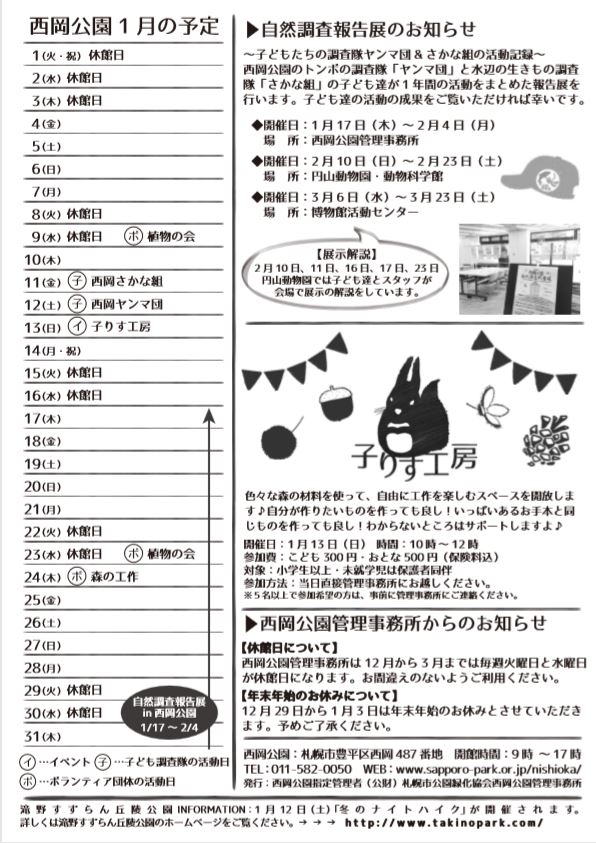 裏面では、2月から開催される子どもたちの調査団体による自然調査報告展のお知らせや、子りす工房のイベント、管理事務所からのお知らせをお伝えしています。
