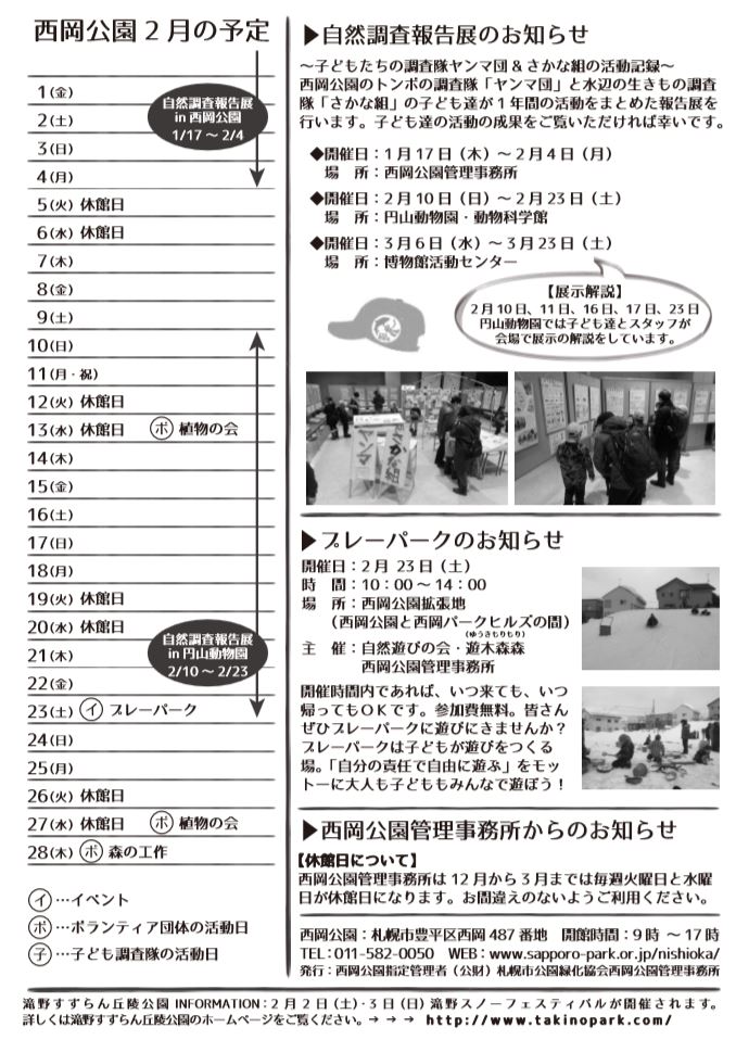 裏面では子どもたちによる調査隊の報告展のお知らせや、西岡公園ボランティア団体の遊木森森(ゆうきもりもり)から「にしおかプレーパーク」開催についてお伝えしています。