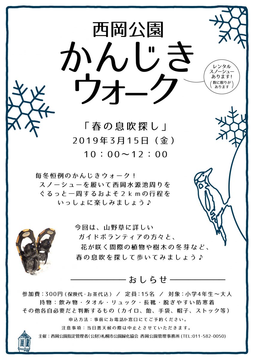 例年、ご好評をいただいている「西岡公園かんじきウォーク~春の息吹探し~」を実施します!