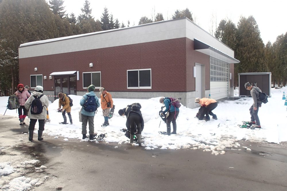 まずは参加者の皆様と一緒にスノーシューを合わせる事から始まります。雪が少ないですからね・・・事務所前では足に合わせるだけにして、園内に入ってからスノーシューを履くことに。