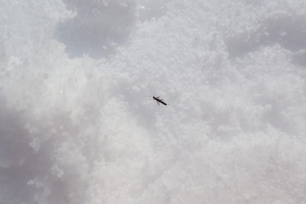 園内に入り、スノーシューを履くと足元にはセッケイカワゲラやユスリカの一種が見られます。写真はセッケイカワゲラ。