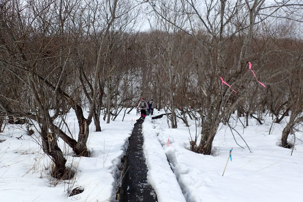 通行可能な木道に関しては除雪作業を行っておりますが、幅が狭くなっている箇所もあり、足元が大変滑りやすくなっていますのでご通行の際にはくれぐれもお気をつけください。