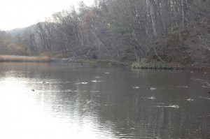 今日は、少しだけ暖かく気持ちが良い日でしたね。 夏の間は少なくなっていた水源池のカモが、今日行ってみたら 50羽以上いました。そして「ピチャピチャピチャ」と、皆で一生懸命 水面を突いています。どうやら水面に落ちた小さな虫を食べているようです。 鳥たちも冬を前に、たくさん食べて栄養を蓄えているのでしょうか。