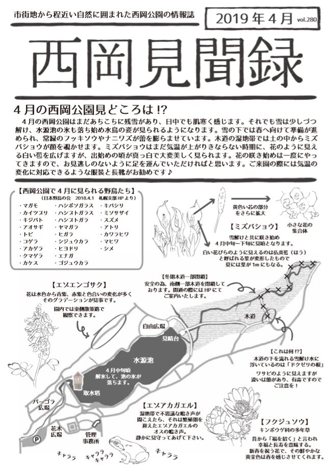 今回、表面ではを早春の園内でぜひ観察して欲しい動植物と西岡公園の春に欠かすことの出来ない花、ミズバショウについて紹介しています。