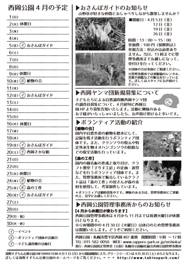 裏面ではおさんぽガイドの開催日や子ども調査員募集のお知らせ、ボランティア活動の紹介、管理事務所の休館日やGW中の開館日についてお伝えしています。