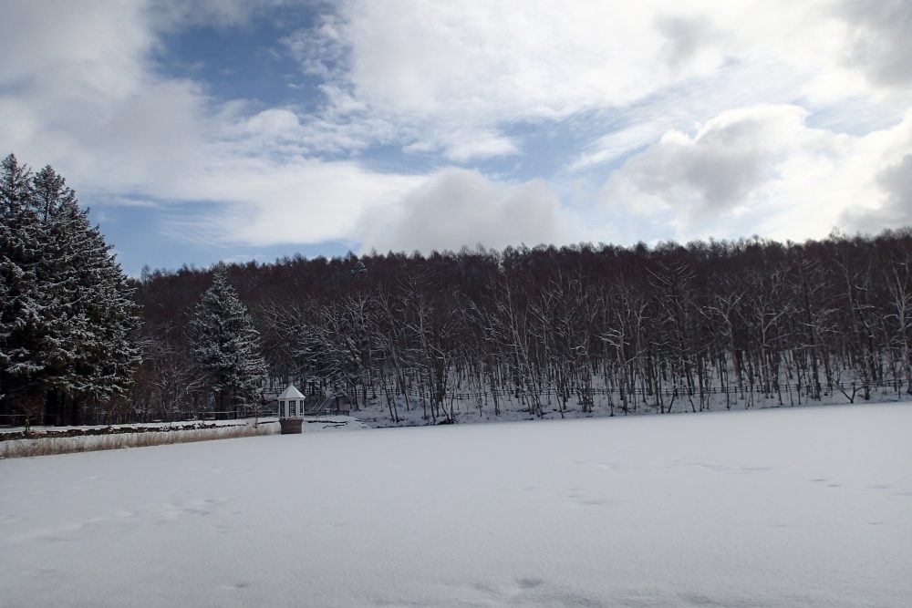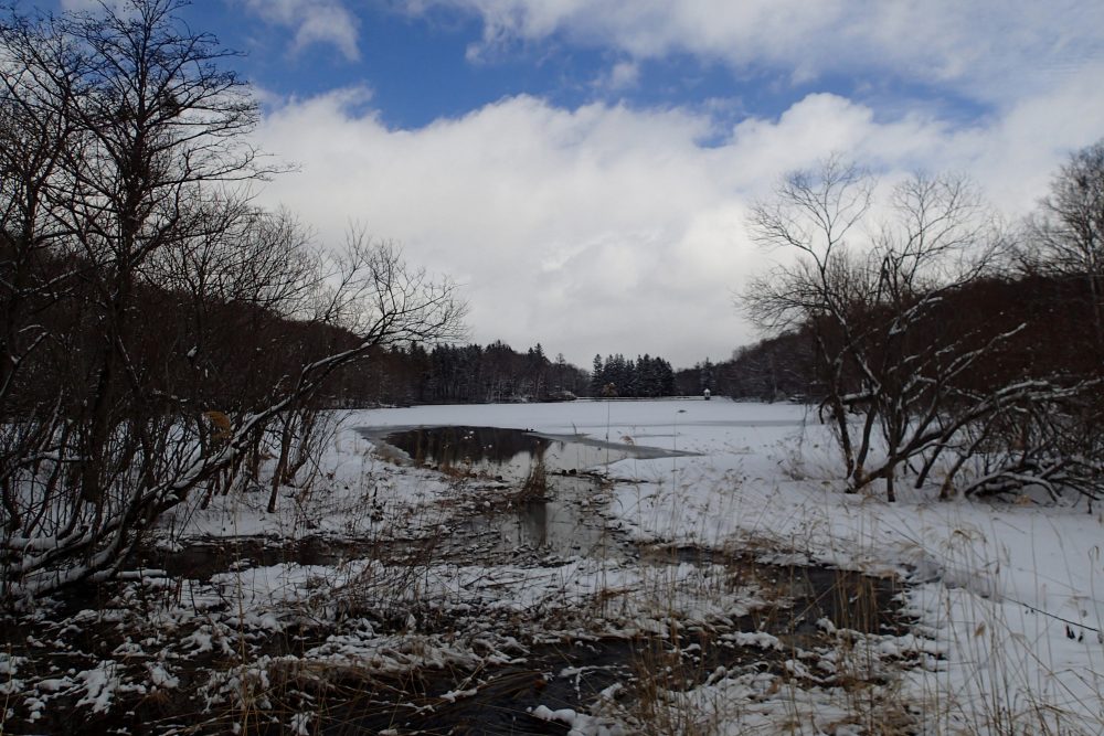 水源池も一面真っ白です!見晴台周辺の水の流れに沿って、池の氷が解け始めた部分に水鳥が戻って来ていました。
