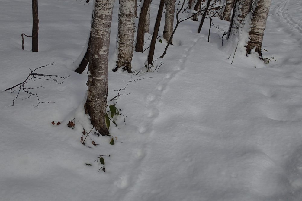 事務所付近でもよく見ることがあるエゾリスと散策路と並行に歩いているキタキツネの足跡。キタキツネの足跡は水源地の上にも残されていましたよ。