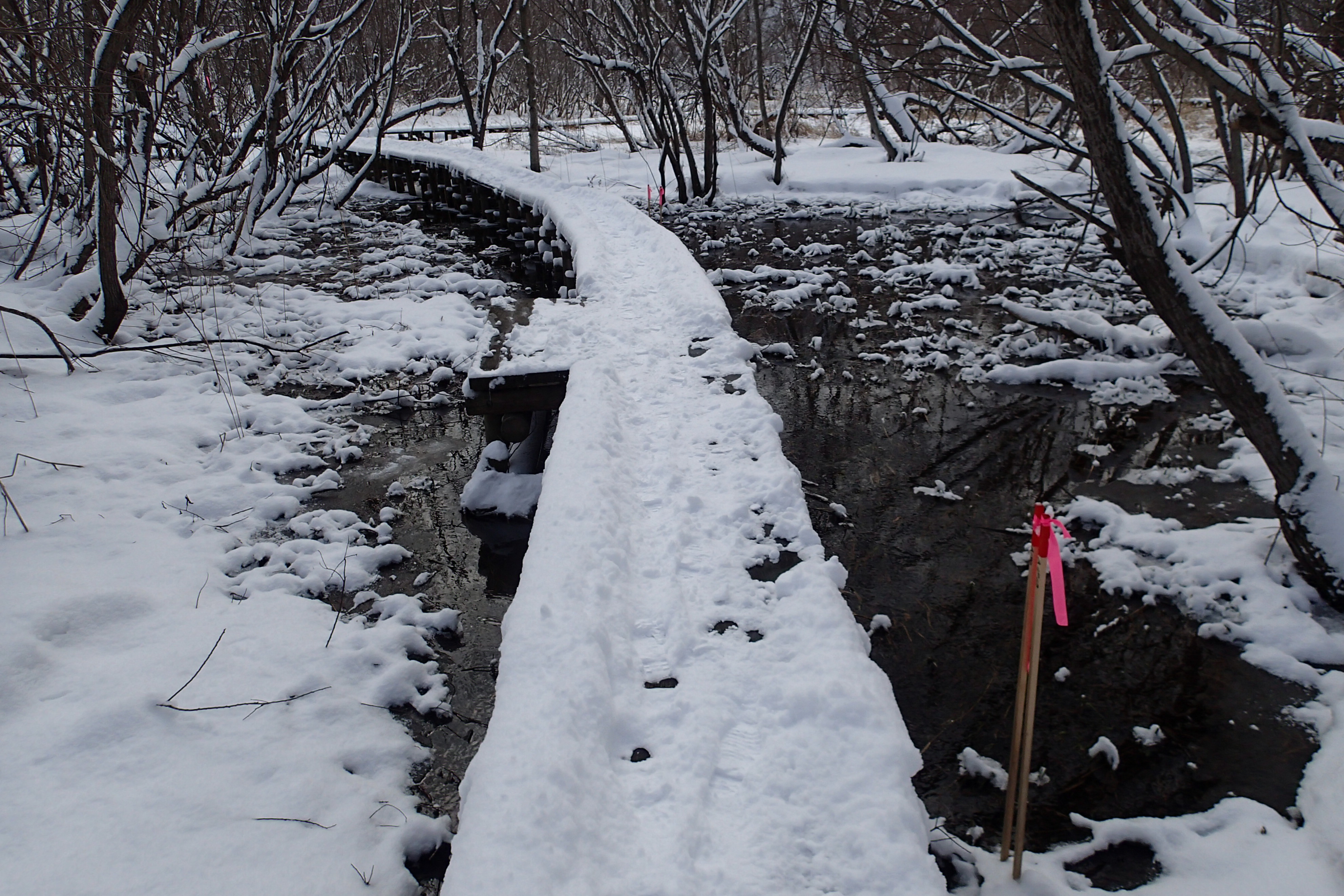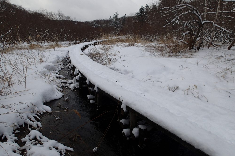 木道も真っ白に。木道の下では雪解け水が少しずつ増えているようです。
