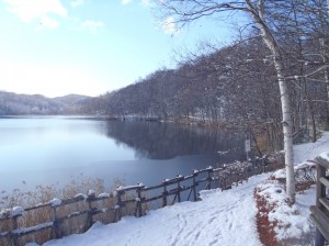写真では判りにくいかもしれませんが、池の手前がうっすらと凍っていました。朝日に照らされた池はキラキラ光ってとても綺麗で、冷たい空気がとても気持ち良かったです。