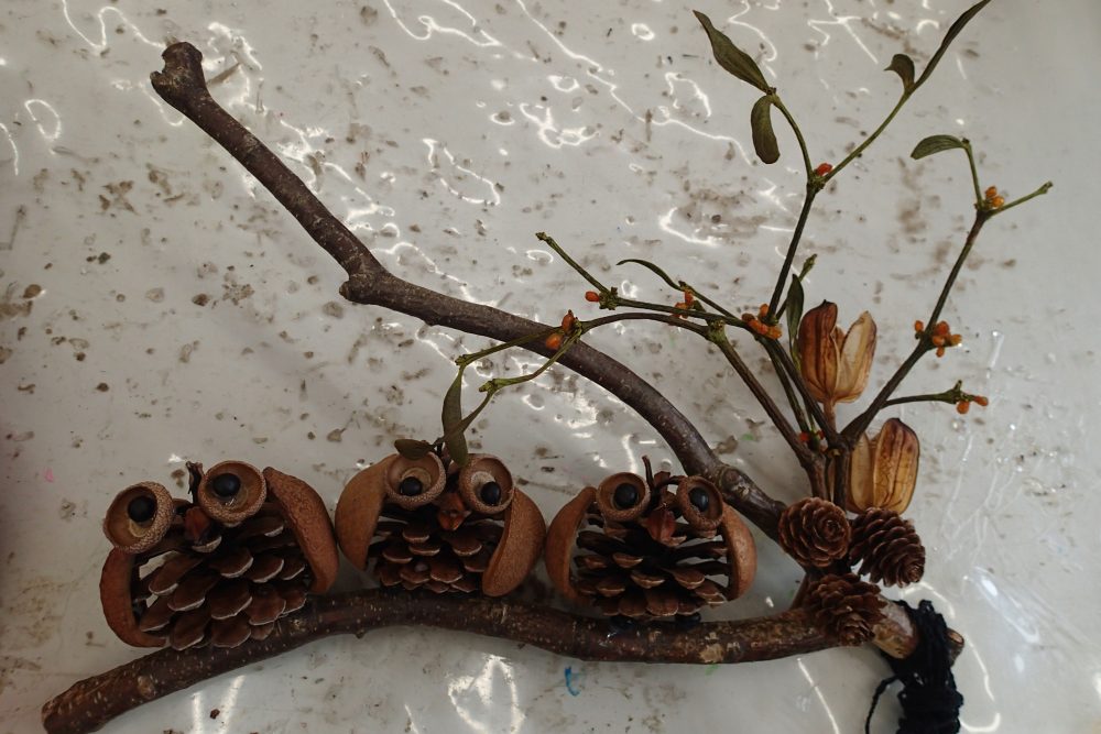 こちらは少し早めですが松ぼっくりに毛糸を巻き付ける「こいのぼり」を作成中♪