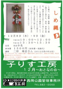 12月の子りす工房~おとなの日は、毎年恒例の「しめ縄」作りです。 今年も、おたる自然の村公社の二杉寿志さんが、日本古来のしめ縄の作り方を やさしく楽しく教えてくれます。 1年の締めくくりとしてしめ縄を作り、新年を迎えませんか?