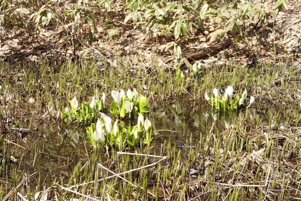 見晴台から南側に向かって中央の木道沿いのミズバショウは高さがまだ低いですが、苞が真っ白で綺麗です。