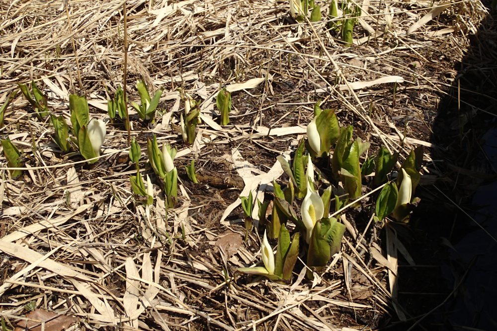 園内の咲き始めは南側から(園内いちばん奥)で雪解けが早かったせいか、葉が焼けてしまったように赤茶色になっています。