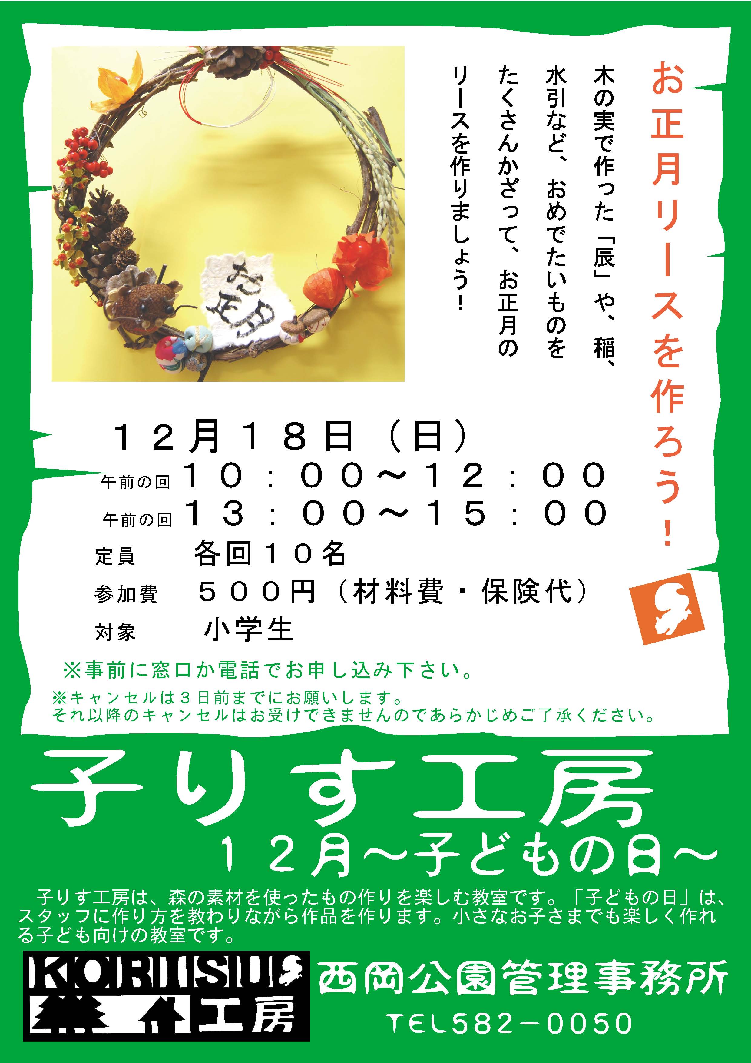 12月の子りす工房~こどもの日は、水引や稲などおめでたいものを たくさん飾ったお正月のリースを作ります。 来年は、「辰年」ということで、木の実で作った辰がにっこり笑っている かわいいリースです。
