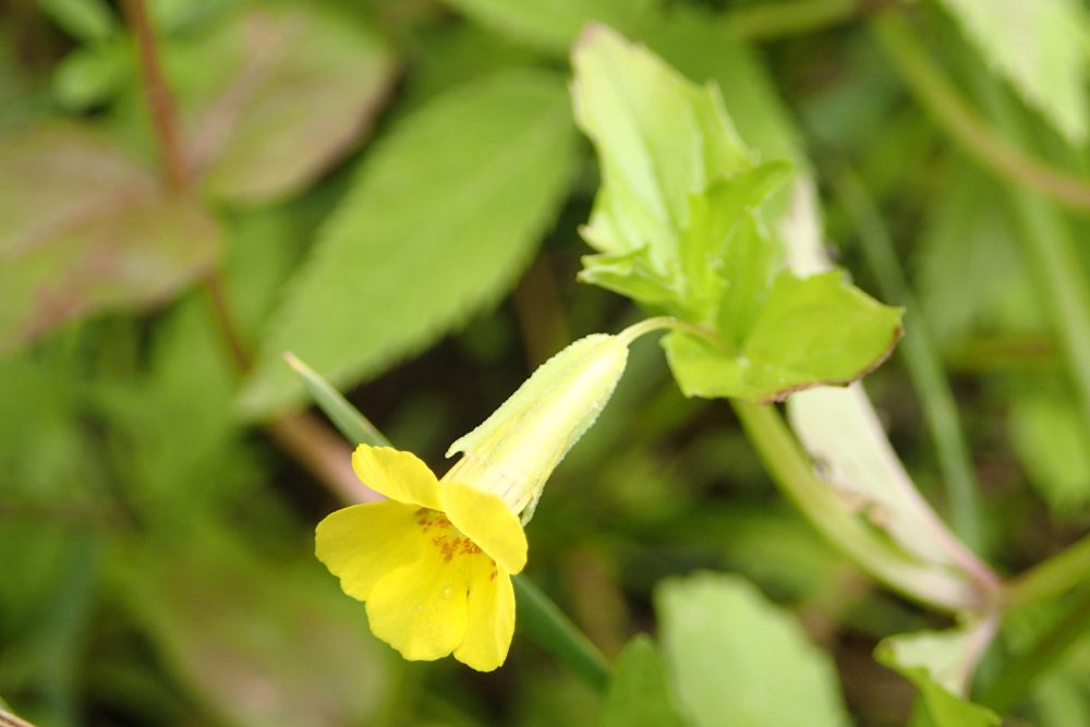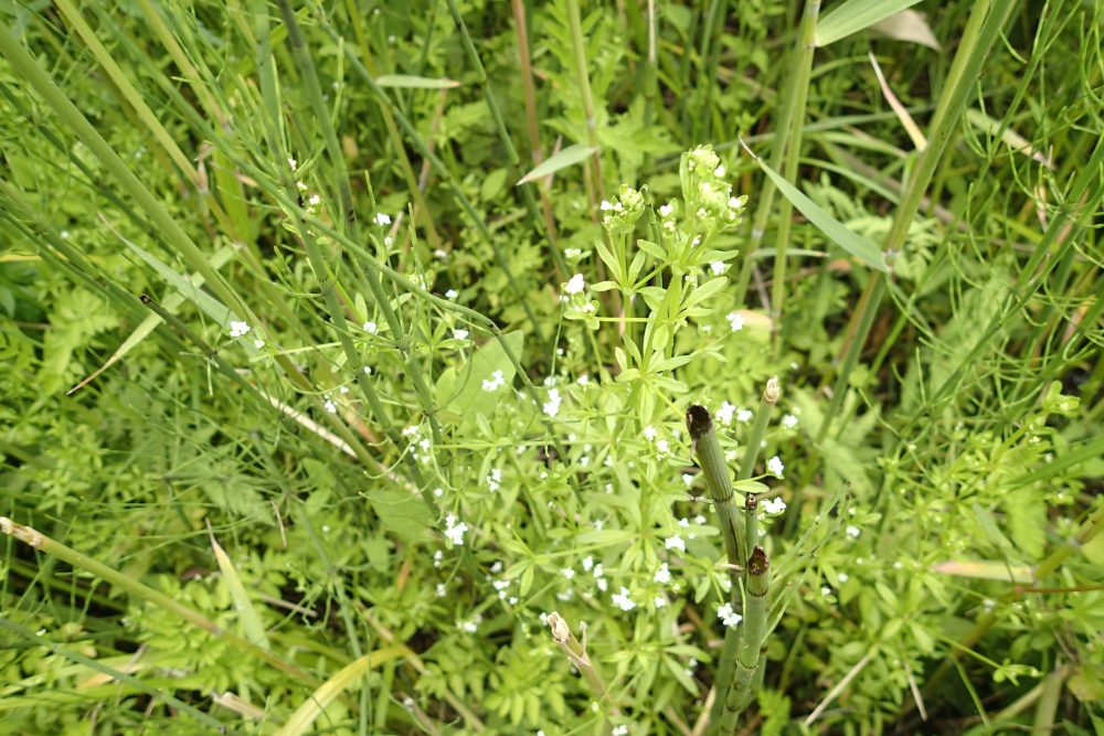 他に開花したのは木道の脇にひっそり咲き始めた黄色い花のミゾホオズキや、群生して咲いている白い小花のヨツバムグラです。