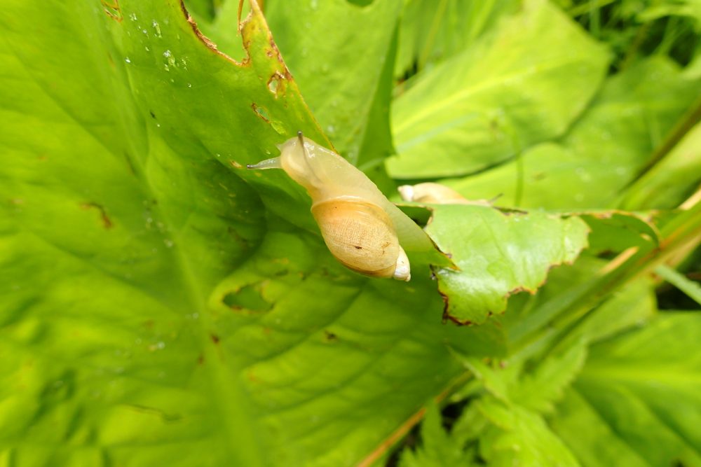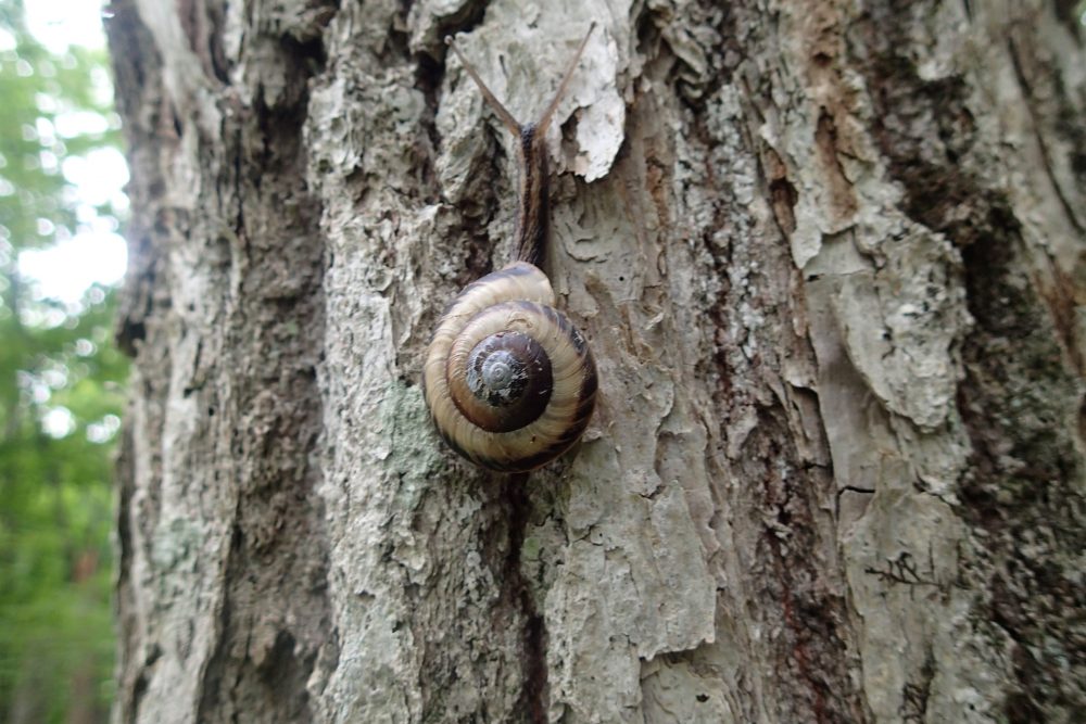 雨の森の中といえば、カタツムリでしょう!西岡公園の代表的なカタツムリが勢ぞろいしました。まずは木の幹や高いところでよく見かけるサッポロマイマイです。頭に殻と同じように線が入っています。