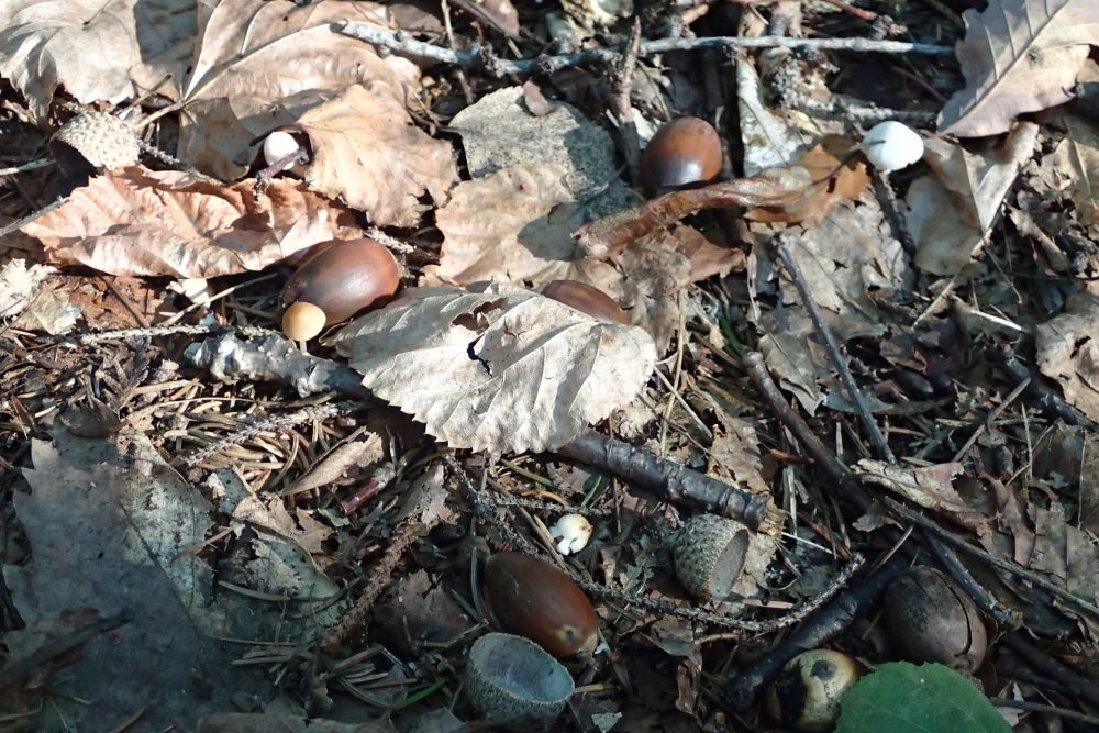 散策路を歩いていると突然「パチンッ」「ガサガサ」と音がして驚かされます。ドングリが落下してきた音ですが、思いのほかドキッとします。林床のドングリは見つけにくいですが、散策路に落ちているドングリは大人でもつい手にしてしまいます。↓