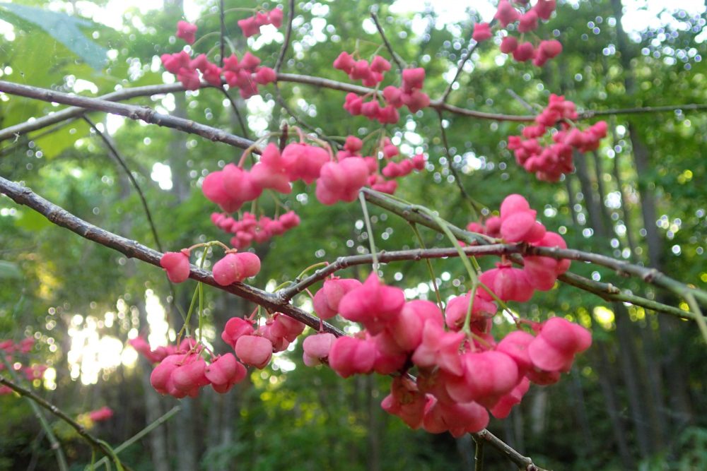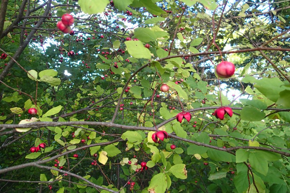 木々の中にも赤い実を付けているものが目立ち始めています。ツリバナの実もはじけました。↓