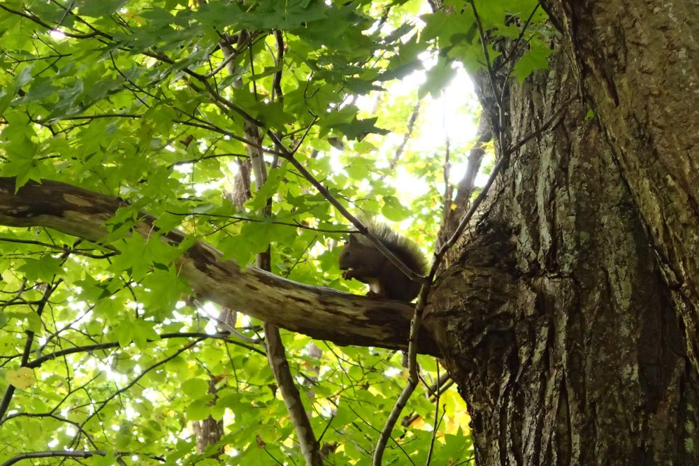 秋の実りはドングリだけではなく、クリも実っています。クリの実に夢中なエゾリスは少し冬毛になり始めていました。